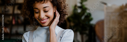 smile, african american, curly hair, afro, female, alone, american, antler, banner, beautiful, black, mobile phone, cheerful, chill, communication, connection, device, digital, enjoy, feminine, girl, green, happiness, happy, hold, home, house, houseplant, indoor, interior, lamp, lifestyle, living room, minimal, mobile phone, newsletter, online, person, phone, plant, relaxation, social network, racked, standing