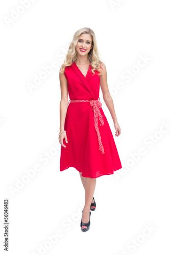 20s, young adult, woman, female, caucasian, white background, cut-out, isolated, attractive, beautiful, beauty, cute, elegance, model, honed, pretty, sensuality, long hair, fair hair, blond, light hair, curly hair, coiffure, blue eye, charming, gorgeous, seductive, body, dress, belt, bow, high heel, elegant, glamour, sensual, sexy, shape, slim, red, thin, slender, posing, evening dress, smiling, smile, portrait, attitude