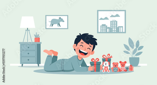 boy, gift, present, toy, children, happy, children, cheerful, indoor, lying, home, celebration, party, childhood, play, cosy, surprise, fun, birthday, holiday, cute, joyful, teddy, christmas, illustration, design, cartoon, vector, bedchamber, happiness, unpack, smiling, relaxed, pajama, domestic, lifestyle, family, comfort, relaxing, resting, christmas, adorable