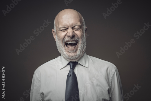 man, businessman, business, manager, laughing, laugh, funny, enjoying, leisure, humor, humorous, joke, prank, mock, mocking, sarcastic, executive, office worker, senior, cheerful, laughter, ridicule, comic, mature adult, portrait, fun, amusement, posing, isolated, face, middle-aged, ridiculous, adult, copy space, shirt, attaching, person, people, corporate, arrogant, professional occupation, boss, director