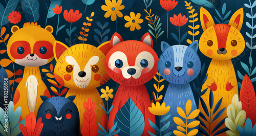 Cheerful Cartoon Forest Creatures with Flowers on a Navy Background