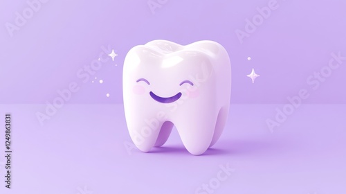 Cheerful cartoon tooth mascot on a purple background with space for text