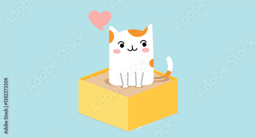 cat, box, yellow, cute, pet, animal, white, sitting, cheerful, happy, adorable, sweet, charming, playful, friendly, lovely, positive, joyful, content, calm, peaceful, nubes, love, affection, pastel, simple, minimal, background, blue, light, drawing, clip art, cat