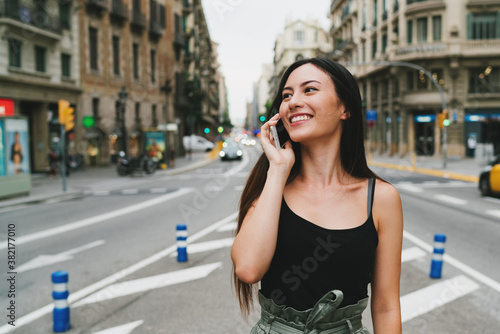 Cheerful caucasian hipster girl standing at the city street and talking on her smartphone. Young smiling woman with long dark hair in trendy outfit having phone conversation while looking aside
