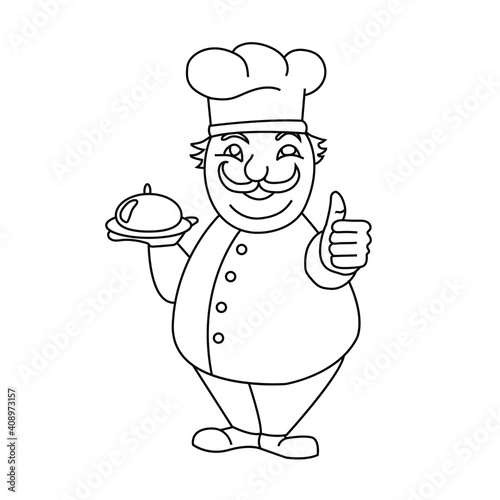 Cheerful chef with a dish. Cooking illustration for signboard menu of cafe, restaurant. Vector illustration