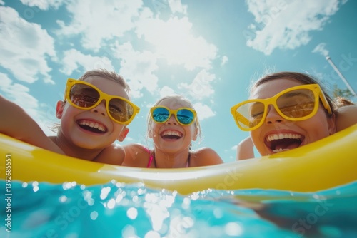 summer, children, swimming, pool, fun, happy, water, sunglasses, float, vacation, children, smiling, cheerful, sunny, bright, blue, clear, poolside, relaxation, leisure, enjoyment, carefree, holiday, playful, togetherness, eyewear, summer, water, swimming pool, childhood, youthful, floatation, refreshing, water sport, waterscape