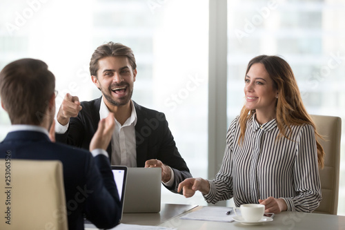 Cheerful colleagues laughing at joke at meeting having funny conversation