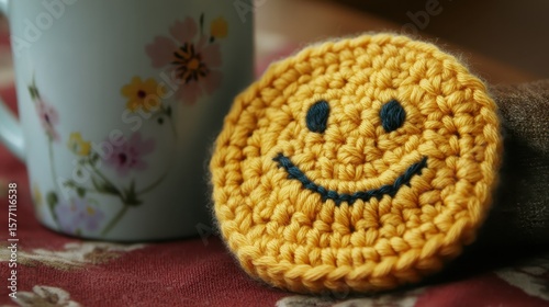Cheerful Crochet Smile Coaster Next to Floral Cup on Table