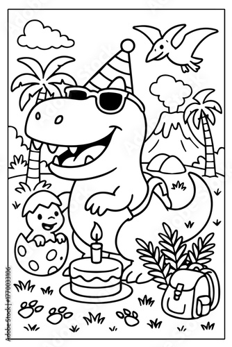 dinosaur, birthday, party, cake, sunglasses, hat, celebration, happy, cute, cartoon, drawing, illustration, fun, joy, smile, egg, baby, hatchling, pterodactyl, flying, palm, tree, volcano, cloud, grass, backpack, leaf, nature, prehistoric, jurassic, age, present, gift, festive, cheerful, friendly, design, art, outline, black, white, isolated, doodle, vignetting, character, animal, creature, tyrannosaurus