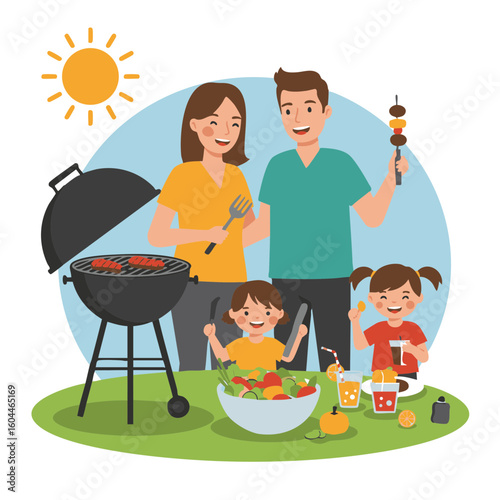 bar-b-q, family, grill, picnic, food, summer, bar-b-q, salad, children, smiling, cheerful, joy, lunch, meat, vegetable, fire, cooking, happy, gathering, backyard, fresh, casual attire, group, sunny, party, friends, bonding, fun, flat, vector, icon, isolated, white, minimal, lifestyle, colourful, healthy, illustration, table, eating, grilling, multicultural, festive