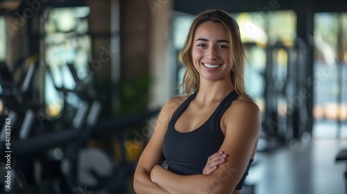Cheerful Female Fitness Trainer in Gym, Promoting Health and Fitness for Diverse Audiences, Suitable for Posters and Social Media Campaigns