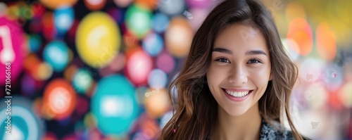 Cheerful female online retail expert, bustling digital marketplace and shopping icons on the background