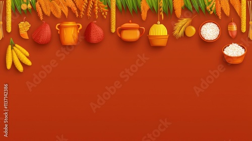 autumn, harvest, flat, illustration, cheerful, simple, background, colours, vegetable, fruit, nut, grain, corn, rice, pot, basket, nature, seasonal, plant, design, clip art, decoration, autumn, element, organic, artistic, creative, visual, culinary, cooking, food, warm, earthy, bright, colours, festive, traditional, landscape, shape, modern, style, texture, natural, warm tones