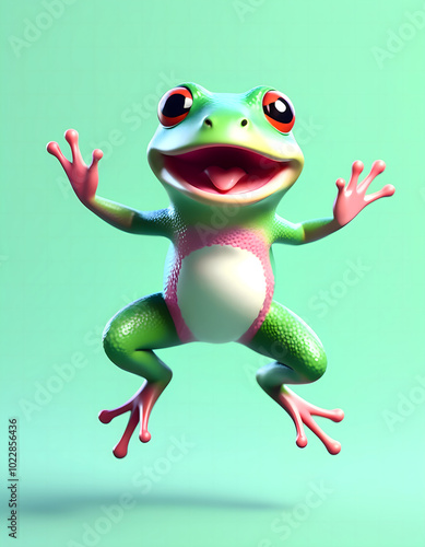 frog, cartoon, cheerful, animal, three-dimensional, leaping, vibrant, whimsical, playful, joyful, character, nature, vivid colors, illustration, fun, digital artwork, stylised, fauna, wildlife, lively, energetic, green background, hopping
