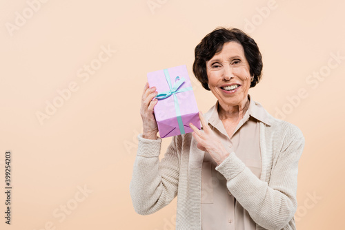 gift, isolated, bow, box, celebration, event, festive, greeting, happy, holiday, present, ribbon, smiling, cheerful, emotion, beige, woman, casual attire, positive, senior, elderly, latino, hispanic, copy space, one person, studio shot