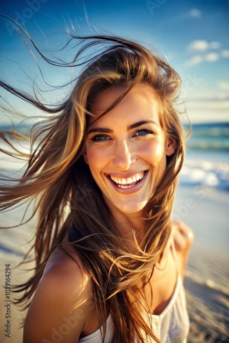 cheerful, hispanic, woman, smile, beach, windblown, hair, portrait, happy, face, ocean, blond, girl, sun, summer, sea, sky, funny, joy, casual attire, fashion, lifestyle, healthy, model, nature, vacation, travel, holiday, warm, wind, breeze, outdoors, sunshine, young, eye, white, blue, casual clothes, photo, photoshoot, relax, 1, people