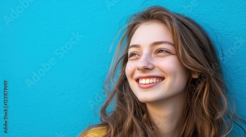 Cheerful long-haired girl exudes joy, vibrant energy radiates in a creative moment.