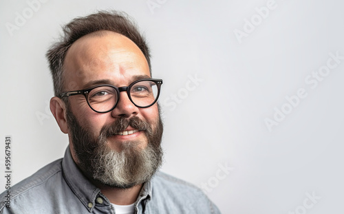 Cheerful man with beard laughing against on a gray background. Generative Ai
