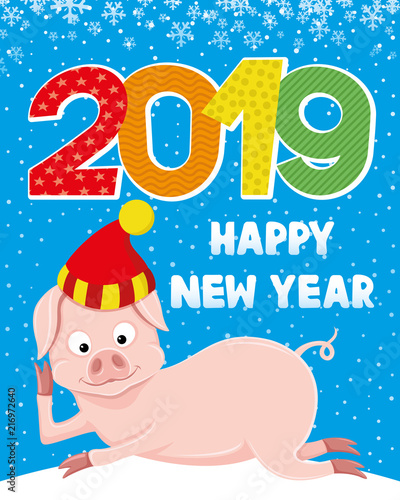 new year, pig, 2019, holiday, congratulation, celebration, chinese new year, greeting, animal, background, blue, card, cartoon, character, cheerful, chinese, cute, event, farm, festive, happy, illustration, mascot, pink, snow, snowflake, sweet, vector, winter