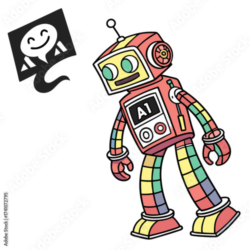 robot, ai, artificial intelligence, technology, character, cute, friendly, cheerful, smiling, speech bubble, symbol, communication, digital, futuristic, cartoon, vector, illustration, graphic, white background, isolated, colourful, red, yellow, green, blue, playful, simple, clean