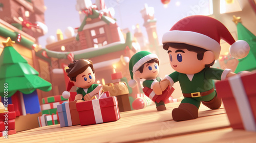elf, christmas, gift, workshop, animated, festive, holiday, children, decoration, cheerful, present, santa, joy, celebration, winter, playful, colourful, teamwork, fun, creativity, seasonal, toy, joyfulness, magic, happiness