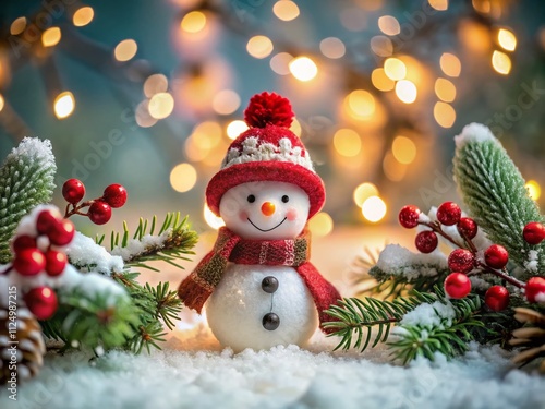 Cheerful Snowman Figurine Surrounded by Pine Branches and Berries, Bathed in Magical Winter Bokeh Lights for a Festive Holiday Atmosphere