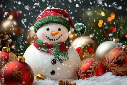 Cheerful Snowman Surrounded by Christmas Ornaments and Miniature Trees in Festive Holiday Setting with Snowflakes
