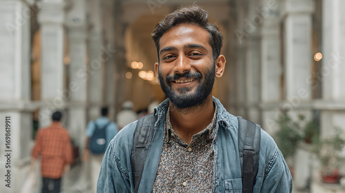 cheerful student standing in university hallway smiling to camera middle east campus youth enjoying education and college student lifestyle learning atmosphere
