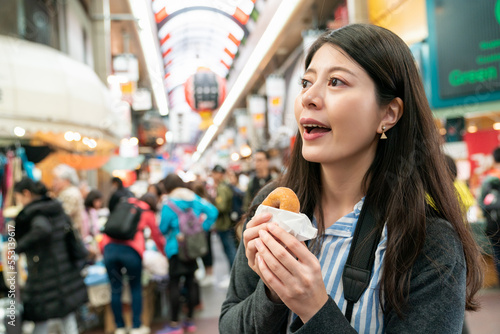 cheerful Taiwanese girl visitor having doughnut street snack in hands and looking around enjoying the active vibe in kuromon ichiba market in Osaka japan