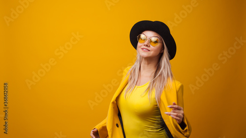 Cheerful trending young woman in bright clothes on yellow background, copy space. Cool blonde