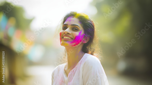 Cheerful Woman Covered in Holi Colors, Wearing White Kurta and Smiling in the Holi Festival