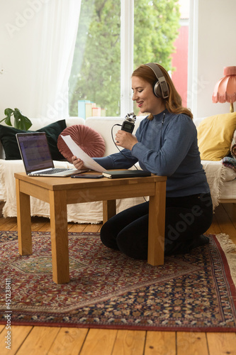 woman, podcast, record, speak, talk, earphones, microphone, mic, host, radio, female, read, note, paper, broadcast, smile, cheerful, delight, content, home, audio, headset, work, contraption, sound, tune, communicate, voice, modern, connection, device, to sit, table, speaker, speech, stereo, electronic, equipment, entertain, job, contemporary, occupation, indoor, blur