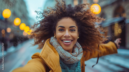 smiling, woman, curly hair, winter, city, street, light, cheerful, happiness, spin, joy, fun, snowy, coat, foulard, lifestyle, fashion, beauty, urban, friendly, candid, social, portrait, engagement, warmth, walking, leisure, excitement, atmospheric, environment, exploration, sightseeing, adventure, youthful, playful, expression, moment, bright, glow, seasonal, friendship, community, interaction, nature, weather, motion, energy, travel