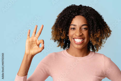 Cheerful Young African American Woman Showing Ok Gesture At Camera, Positive Black Millennial Female Showing Okay Sign, Expressing Approval While Standing Over Blue Background In Studio, Closeup
