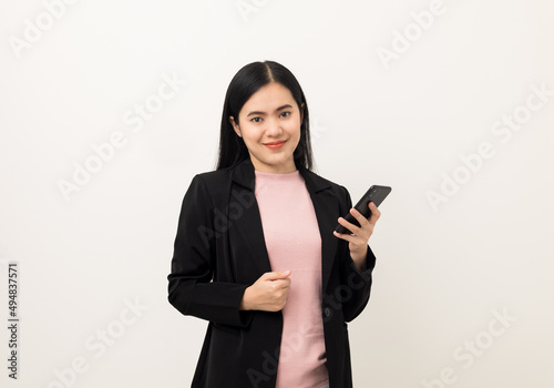 Cheerful young Asian woman using smartphone and checking message on mobile chat application isolated white background. Fashion style asian lovely woman playing game or shopping online by cellphone