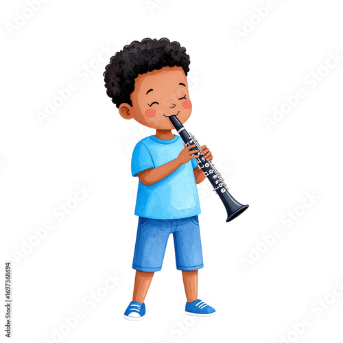 boy, children, children, music, instrument, clarinet, woodwind, musical, player, performance, play, happy, cheerful, smiling, fun, joy, hobby, leisure, activity, education, learning, practice, talent, skill, black, afro, curly hair, blue, short, shirt, shoe, sneaker, illustration, watercolor, drawing, cartoon, art, design, isolated, cut-out, studio, portrait, young, cute, adorable, musician, melody, sound, concert