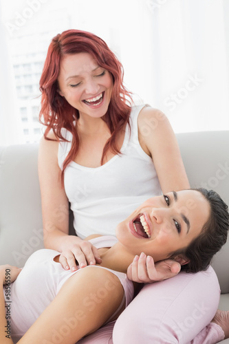 20s, young adult, woman, female, caucasian, indoor, home, house, comfortable, sitting, pretty, attractive, friends, friendship, slumber party, casual attire, smiling, happy, relaxation, cheerful, beautiful, happiness, lifestyle, leisure, apartment, together, living room, sofa, couch, affection, human relationships, partiality, friendliness, closeness, companionship, friendly, lying, resting, brunette, brown hair, redhead, red hair, tank top, laughing, fun, mouth open