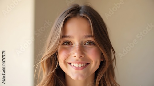 Cheerful young girl with wavy brown hair and bright smile, exuding warmth and happiness against a soft background.