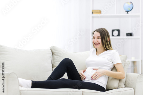 cheerful, ecstatic, mother, pregnant, white color, facial expression, human face, eltern, sofa, stomach, smiling, looking, sitting, abdomen, living room, touching, anticipation, eye, cushion, background, white background, idea, waiting, one person, adult, young adult, happiness, relaxation, nose, photo, hand, human hand, excitement, new life, mouth, finger, home interior, domestic life, cosy, comfortable, creativity, casual clothes, clothing, hair, human lips