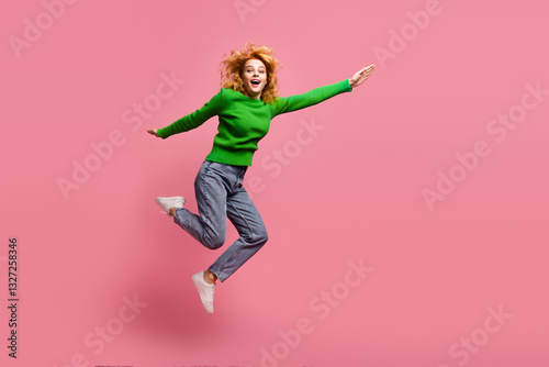 female, woman, girl, young, fashion, model, stylish, trendy, green, jumper, pullover, casual attire, style, red, curly, hair, beautiful, attractive, charming, lovely, happy, funny, spring, holiday, pink, background, advertising, shopping, promoting, jumping, active, energetic, vibrant, joyful, motion, freedom, positivity, exercise, fitness, portrait, cheerful, dynamic, playful, youthful, colourful, mature, sweater, up, positive, sale