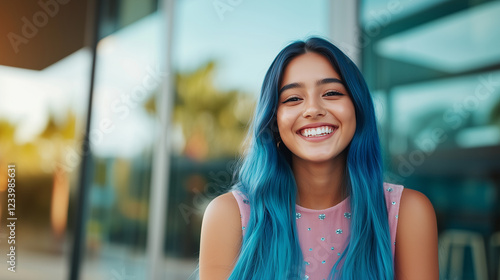 cheerful young woman with long blue hair smiles brightly in a cozy pink dress. Her carefree attitude and radiant smile pop against the sleek silver backdrop, radiating positivity a