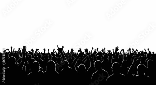Cheering Concert Crowd Silhouette with Raised Hands on White Background, Music Festival Audience Vector Illustration