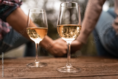 Cheers to Togetherness, Man woman Enjoying Wine and Refreshments Celebration holding hands