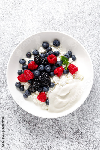 Cheese cottage with yogurt and fresh berries. Curd with blueberry, raspberry and blackberry, top view