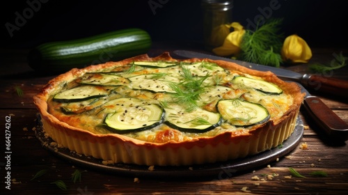 Cheese leek and zucchini tart on rustic backdrop