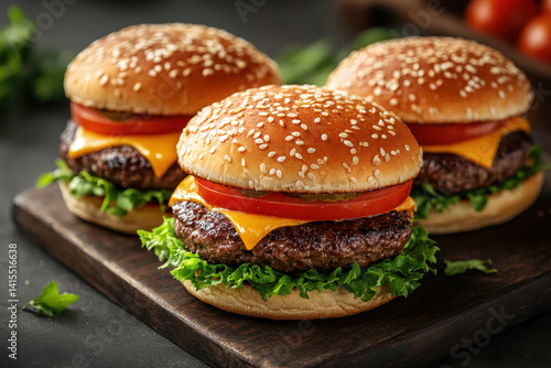 cheeseburgers on a wooden board, garnished with lettuce, tomatoes, and melted cheese, ready to be enjoyed for a delicious meal.