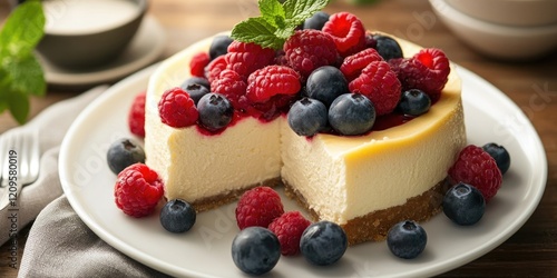 Cheesecake slice with fresh raspberries and blueberries garnished with mint on a white plate, with soft natural lighting and wooden background