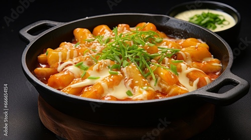 Cheesy Tokbokki, a traditional Korean dish, is presented on a blackboard background, creating a visually appealing and mouthwatering lunch dish