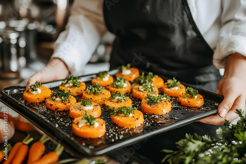 Chef carrying a tray of delicious roasted carrot slices, garnished with herbs and a creamy sauce. Perfect for culinary, food blog, or restaurant websites.