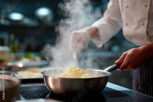 Chef cooking fresh pasta in professional kitchen with steam